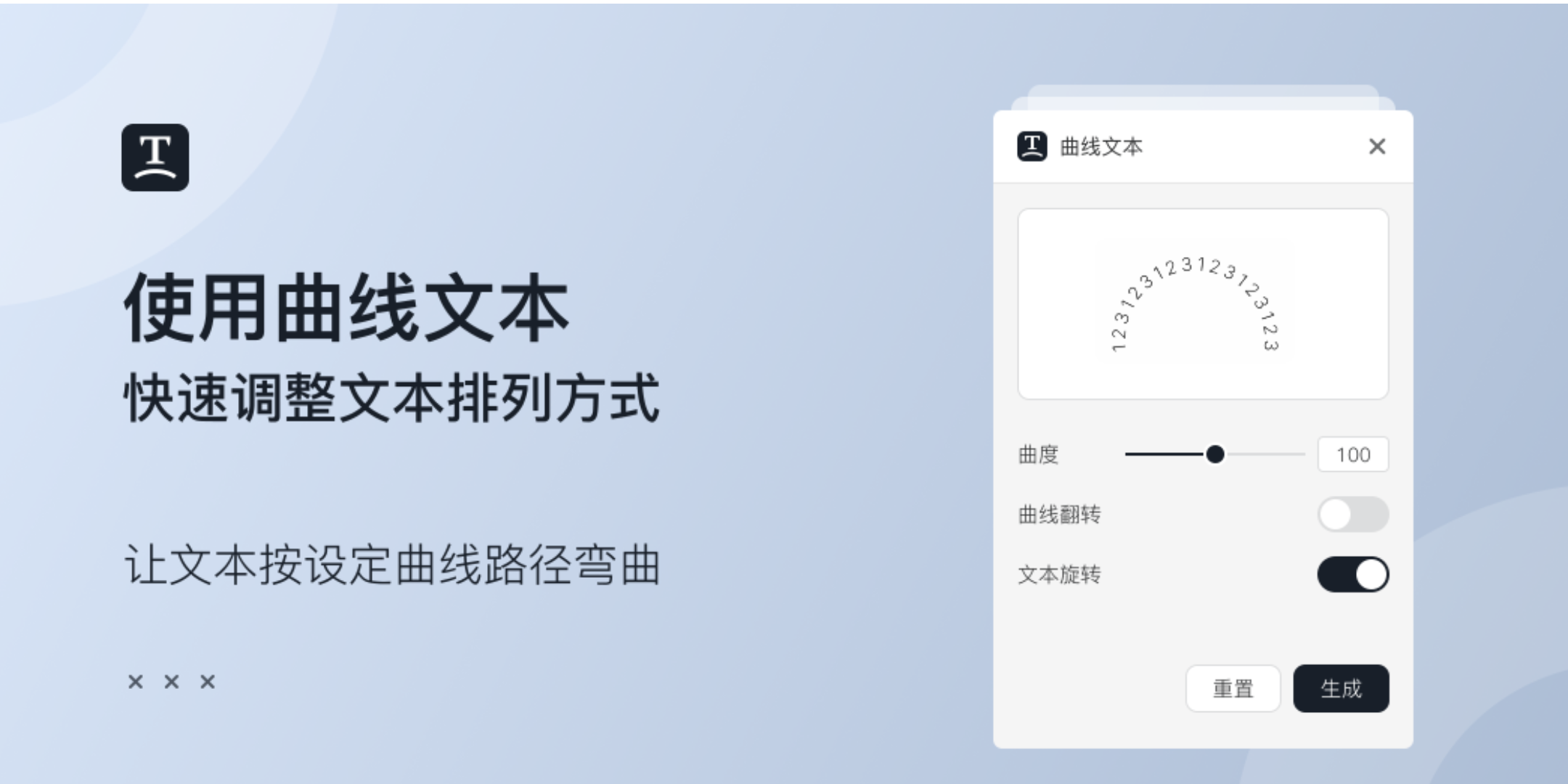 使用曲线文本插件,可以让文本按特定弧度进行排列,具体功能如下: 1. 支持设置文本排列弧度; 2. 支持设置弧度方向和文本旋转。